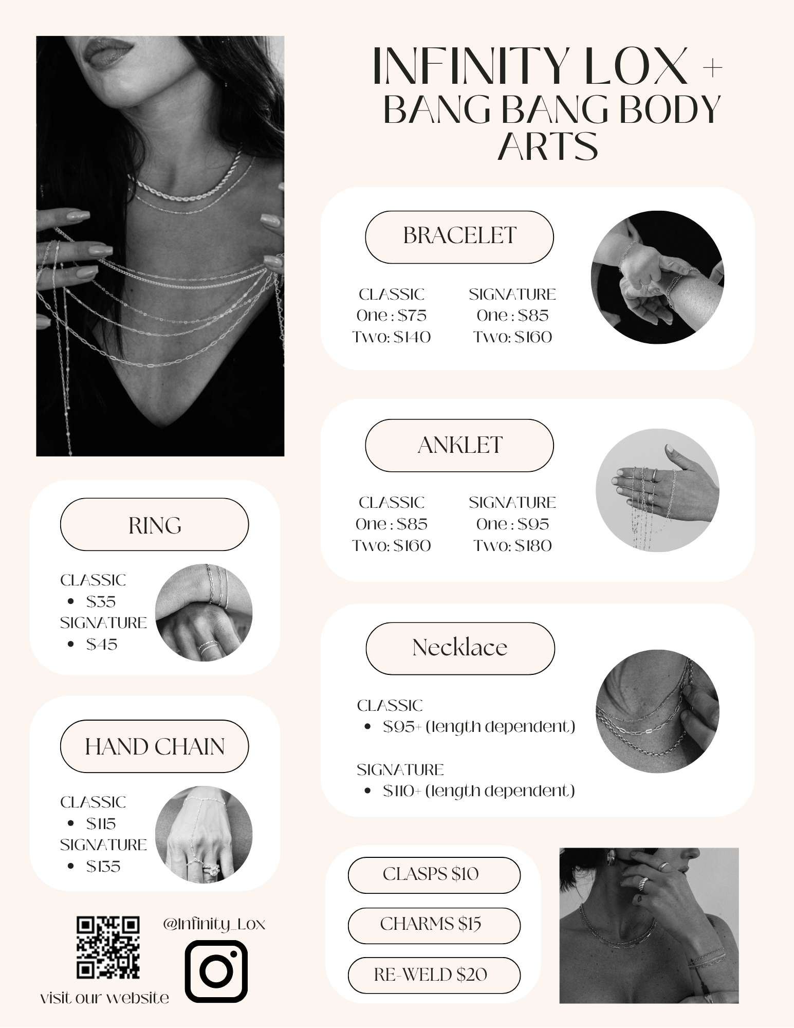 Below are the current prices and chain options available exclusively at our Bang Bang Body Arts location.